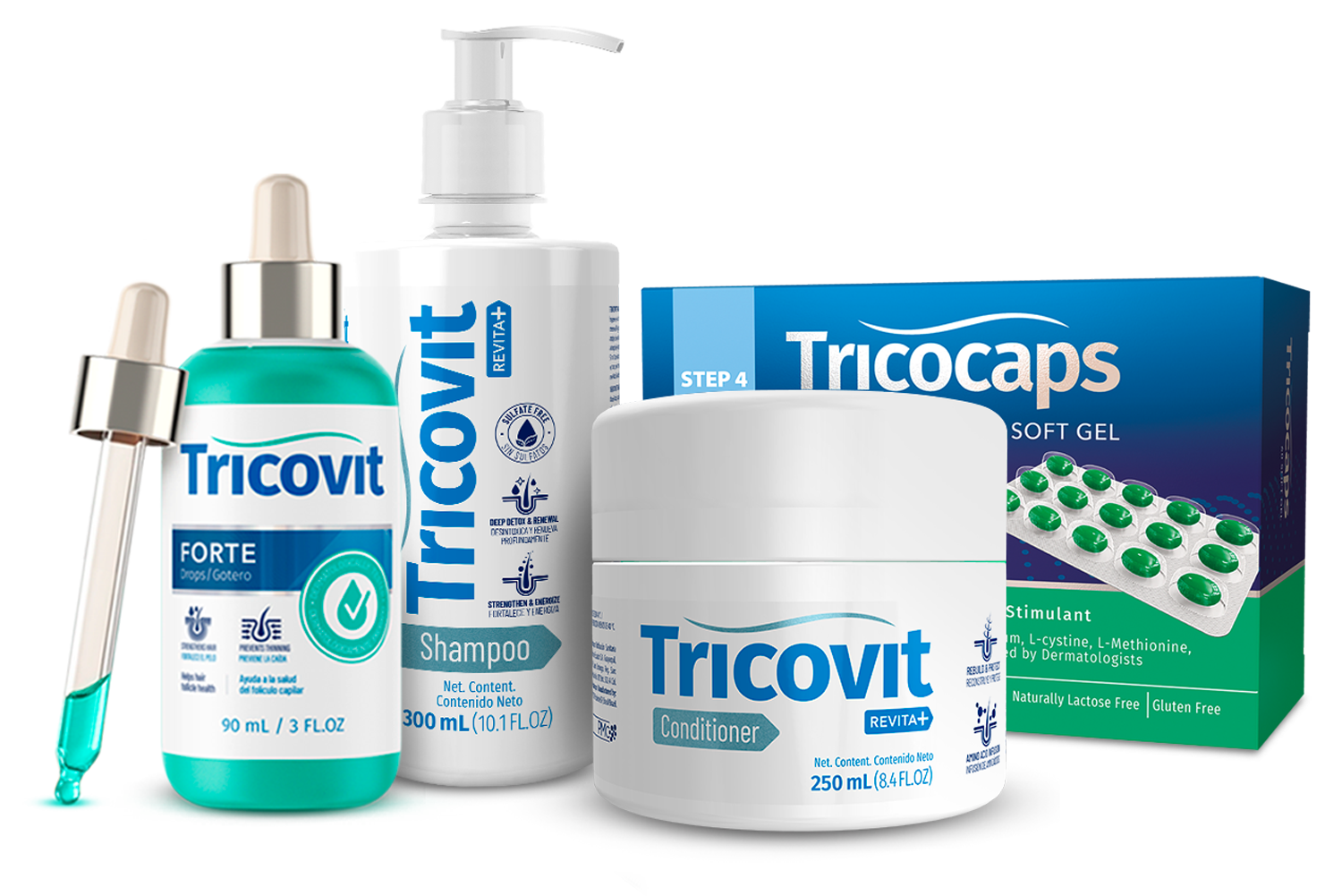 Kit includes: Tricovit Shampoo REVITA+, Tricovit Conditioner REVITA+, Tricovit Forte Drops and Tricovit Pro Soft Gel capsules