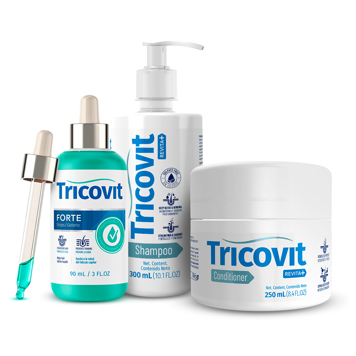 Kit includes: Tricovit Shampoo REVITA+, Tricovit Conditioner REVITA+, Tricovit Forte Drops